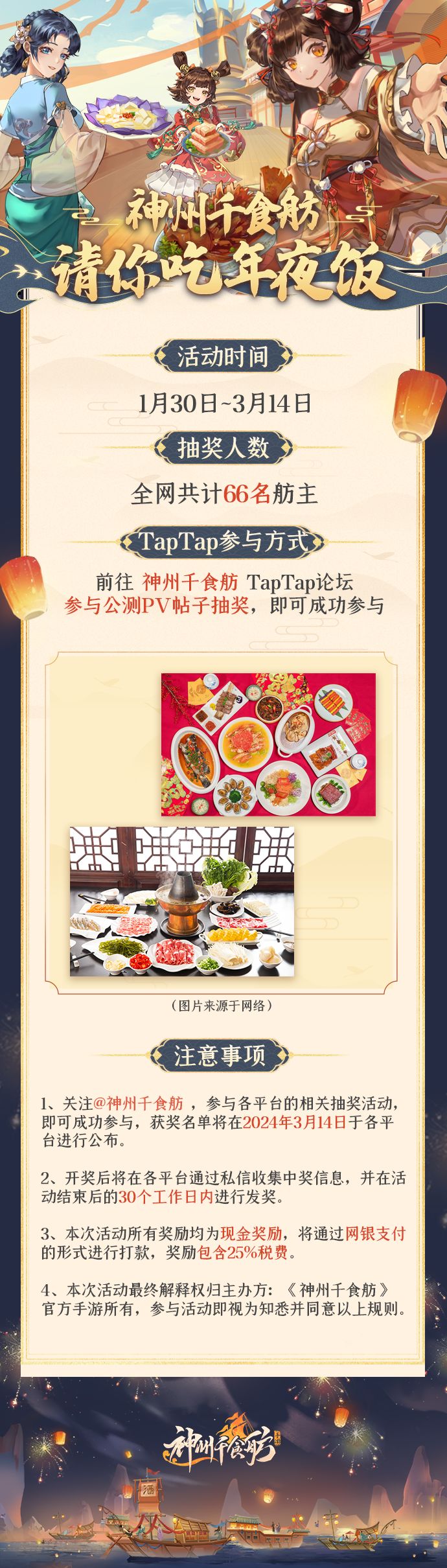 ▌参与方式: 前往神州千食舫TapTap论坛,关注神州千食舫,于本条帖子评论回复游戏内截图,即可成功参与抽奖!粥粥将随机抽取5位舫主,每人送出【300元年夜饭基金】好礼!