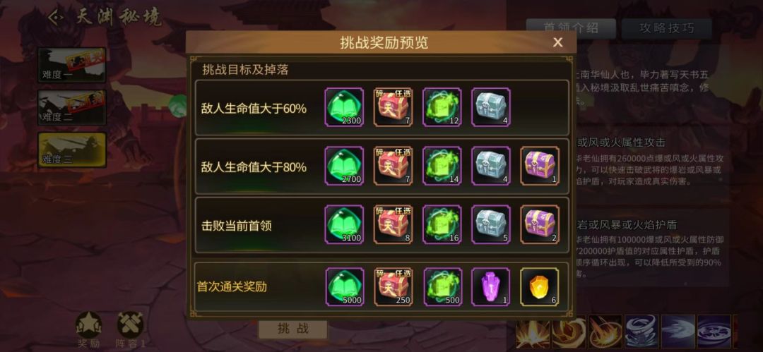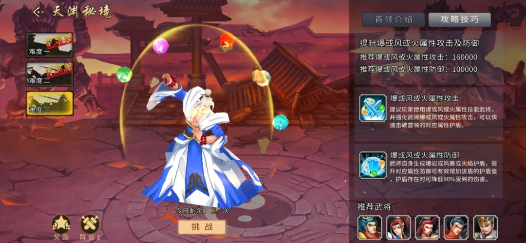 五蕴秘境副本全部成功单通难度3的玩家才能开启天渊副本,而单通天渊难度二且队伍属性达标才能开启天渊三的挑战。有别于难度一二的双属性气盾,天渊三的南华老仙是爆风火三属性护盾,循环往复渐次结盾破盾。上阵武将建议是全属性技能,还要兼顾破盾和输出,综合难度高出了不止一个维度。