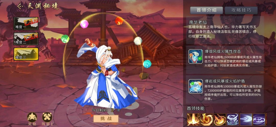 天渊三守关boss南华老仙,擅长使用爆、风、火三系法术,且均具备极高的杀伤力与攻击范围,绝对是当前手游最强守关boss!200秒的挑战时间,期间南华老仙会频繁地使用爆、风、火三系法术技能,对我方武将造成较大幅度的杀伤。根据悟饭平台数据,老仙血量为14.32亿,三个挑战武将轮番负责属性对位的破盾,还要兼顾输出和不损将,难度极大。但打不赢可以退出嘛,希望玩家通过前期的熟悉和演练,相信只要属性达标、操作得法,难度三破关并非遥不可及。