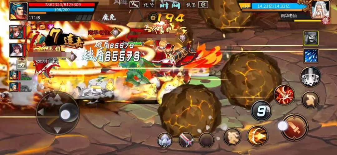 飞将吕布配合援军司马快速破盾后输出,飞将吕布尽量用弓形态蓄力远程攻击,能不贴脸就别近身输出,毕竟贴脸容易被秒,有控制的时候再贴脸戟形态输出。接着老仙结风盾,此时切神武小乔,攻防一体,充分利用长按技能的增益效果打出更强的破盾和输出表现,用张凌剑规避伤害并收集怒气后追加带无敌的超大增伤和重置双方技能,做到技尽其用、稳妥推进。而后到火盾切换蔡文姬带援军周瑜破盾,可以破盾后继续输出也可以提前切换飞将吕布输出再应对接下来的爆盾……另外,在闯关的过程中,尽量利用走位、技能、道具护法来躲避老仙的属性技能攻击。老仙习惯释放爆系滚石、风系旋风和火系近乎全屏的火书攻击,配合其驱散、至强霸体等其它魔法效果加持,这也使得南华老仙成为最强守关boss,想要斩杀通关绝非易事,进一步加大了天渊三的难度。