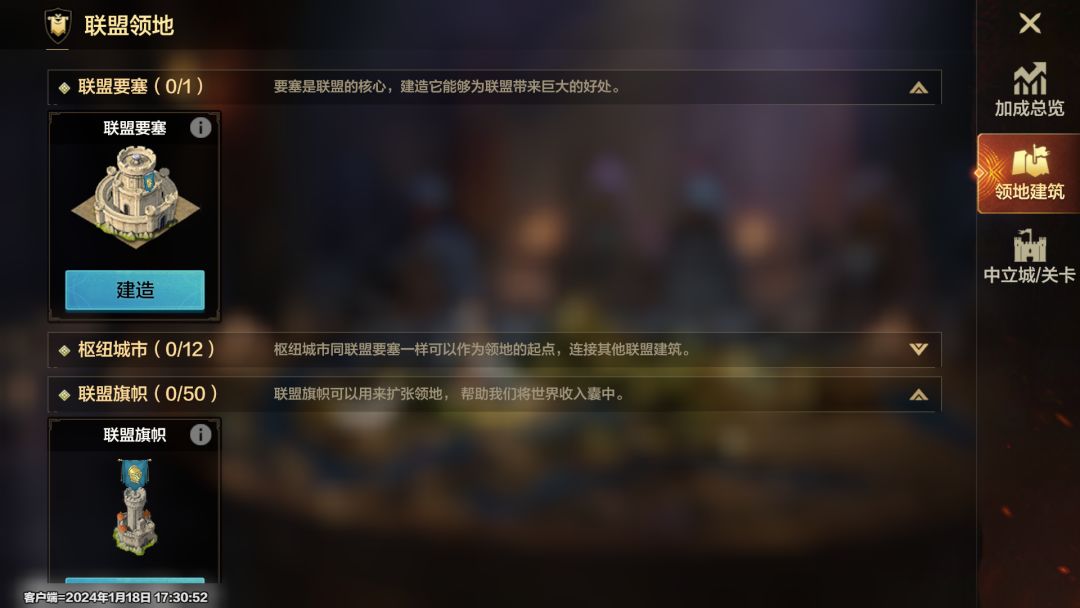 ①加成总览该页面展示了联盟当前占据的所有中立城/关卡和领地建筑,领地会为全体成员带来增益效果,并根据势力值给予每日资源奖励。