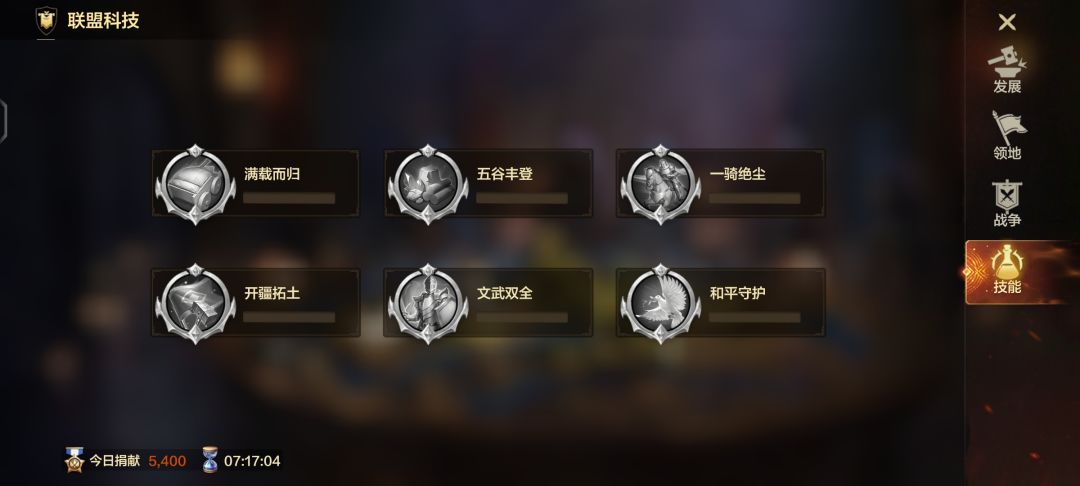 ④技能:研究完成后可以释放,有持续时间与冷却时间。1、满载而归:提升联盟成员攻打资源点,获取的资源总量。2、五谷丰登:提升联盟成员城郊资源建筑产出速度。3、一骑绝尘:提升对游击军团单位的伤害和部队行军速度。4、开疆拓土:提升建造联盟旗帜的速度。5、文武双全:提升英雄所获经验值与部队的攻击力6、和平守护:提升联盟成员部队防御力。