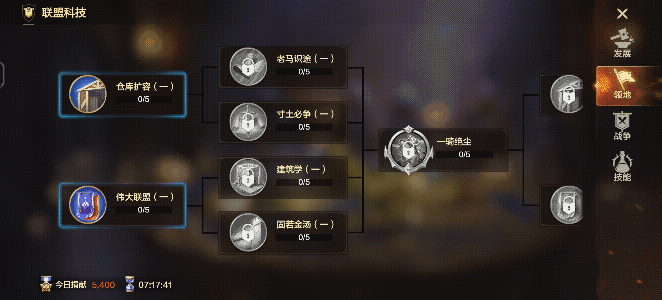 ②领地:仓库扩容提升联盟仓库容量,伟大联盟提升联盟旗帜数量,老马识途提升联盟成员在领地行军速度,寸土必争提升成员在领地作战攻击力,建筑学降低联盟建筑建造积分,固若金汤增加联盟建筑耐久度,工匠行会提升联盟建筑建造速度,突袭者提升攻城速度。
