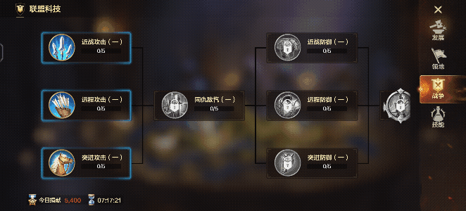 ③战争:近战攻击与近战防御分别提升战士、护卫攻击与防御。远程攻击与远程防御提升射手、法师攻击与防御。突进攻击与突进防御提升骑士、游侠攻击与防御。同仇敌忾提升士兵生命值,快速集结提升征兵速度,长驱直入提升部队在领地上的伤害。