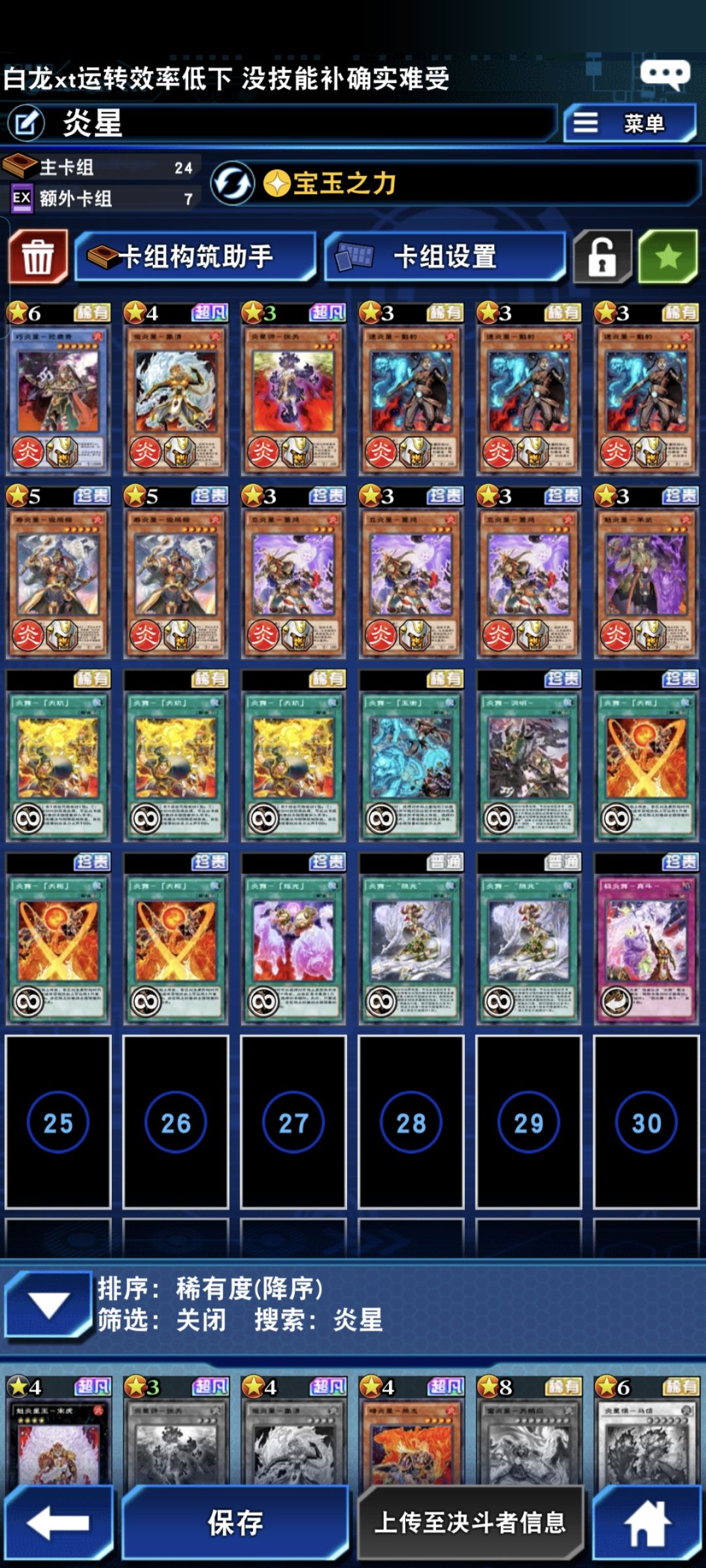 炎星,最爱的卡组之一。具有很强的操作感,且全是中国水浒为原型的卡组,很有特色。(强度看胡牌程度和做的场子)不过凑齐较难。