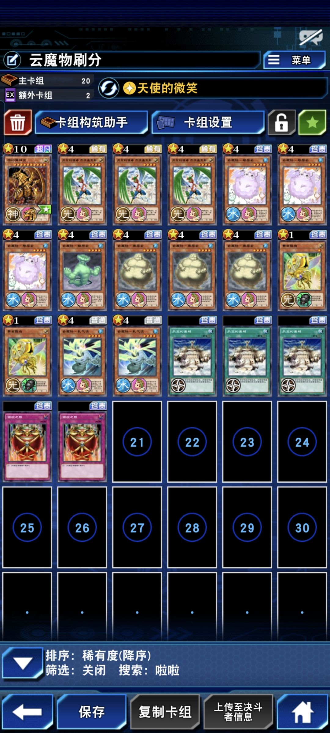 强烈推荐的一套刷分卡组,本家云魔物全是低罕卡,非常容易凑齐,而且只要拿到翼神龙就能开始刷分,额外一个免费的拉拉队,轻松8000+的分数。比起芳香刷分,优点是不用肝迷宫。