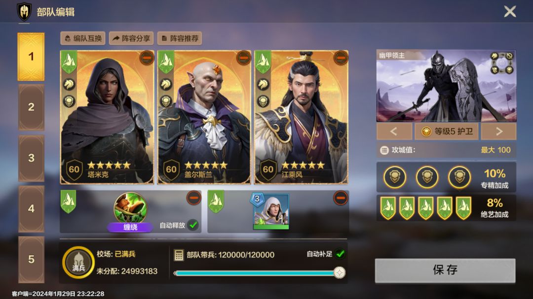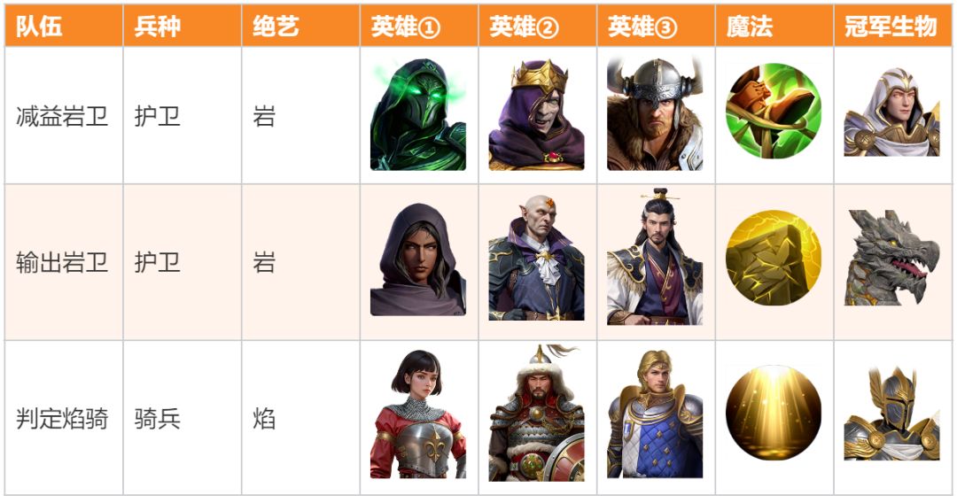 - 普攻伤害及护盾为主的护卫终极阵容,英雄获取难度较高,可获得全额兵种和绝艺属性增幅。