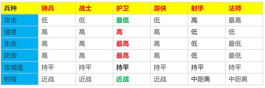 兵种属性在搭配阵容前,我们首先要了解护卫兵种的属性特点,这样才能扬长避短,针对性搭配。