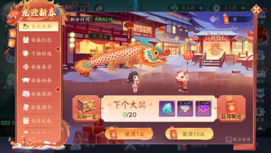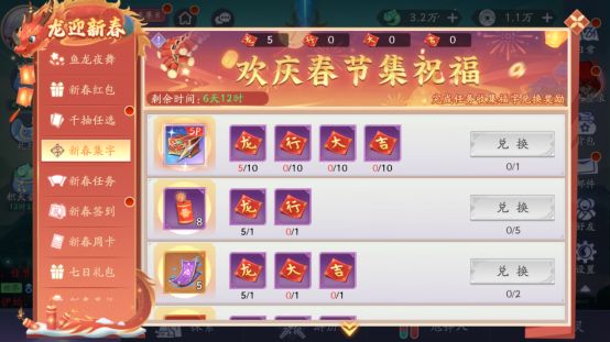 活动期间完成任务,可以获得大量集字道具,可用于在新春集字活动中兑换奖励。