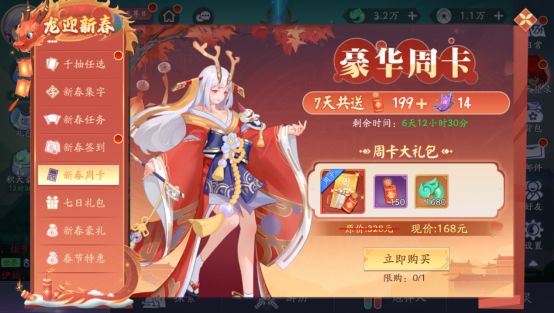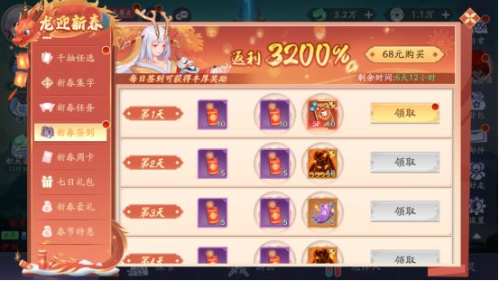 购买新春周卡,每天上线领取,可获得大量鞭炮和唤灵符。