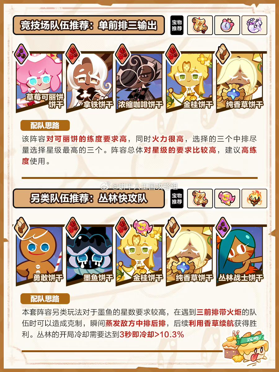 竞技场阵容推荐,其中1~3队是目前比较主流的队伍,4队对于配料、星数、宝物有一定需求。