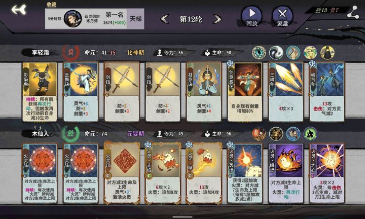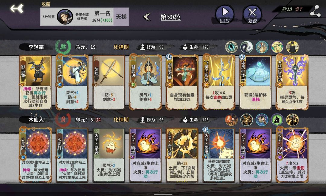 第13轮梭哈了一波,换上了飞灵闪影剑和万法归灵剑,后面一直连胜,靠着悟道丹(玩的炼丹师)一直升级牌,还补上了一张冰灵护体丹。