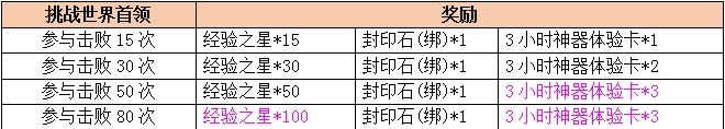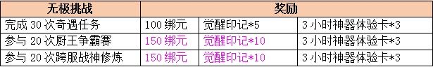 活动期间,完成挑战目标可领取海量绑元、觉醒印记和神器体验卡(3小时)