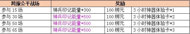 活动期间,参与跨服公平战场满指定场次可领取海量神兵印记能量、绑元和神器体验卡(3小时)