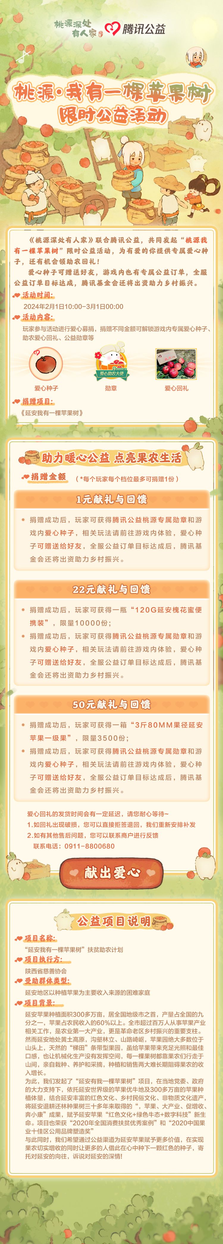 限时公益活动即将开启萝!播种下一颗种子,长成桃源中,茂盛繁密的果实,承载希望和爱心,助力乡村振兴的同时,还可以获得游戏奖励~