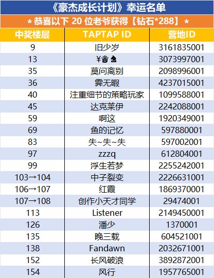 抽取20名老爷送出:【钻石*288】