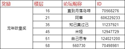 截止到2月15日23:59,本次福利活动回帖的有效楼层截止至59楼,起始楼层为2楼,开奖结果如下: