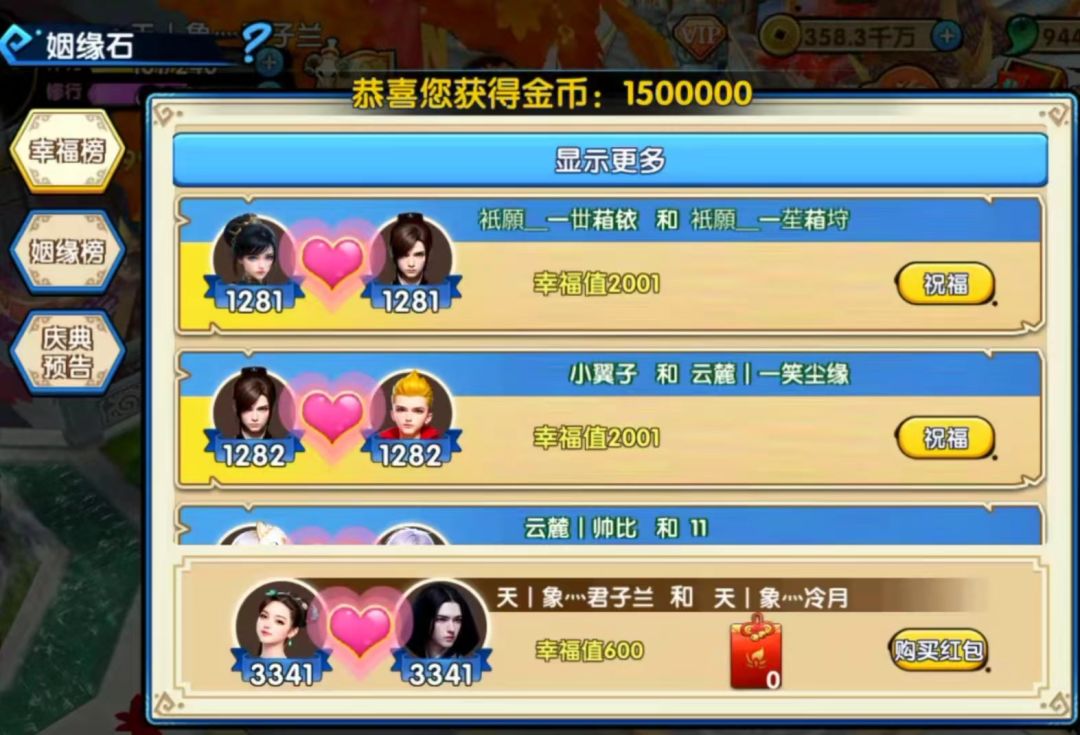 仙侣双方在幸福榜中放入相亲相爱、甜甜蜜蜜、海枯石烂红包,吸引更多的仙友祝福自己,购买红包需要消耗勾玉。