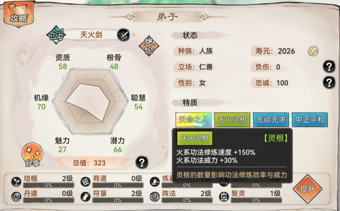 相对于前排肉盾弟子,后排的输出弟子则有着截然不同的特点。由于灵根越少威力越大,对于输出弟子而言,拥有一个灵根,即天灵根,是最好的选择。从天命的角度来看,剑修的弟子如果以水功法为主,会更依赖于剑诀功法,因此天命带有养剑、剑意是相当不错的;而如果以火功法为主,则可以转而追求火灵之体、玄仙之体等体质。