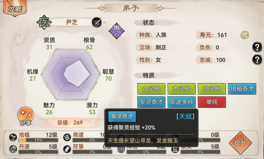 后排除了输出弟子,通常还会有一个辅助弟子。辅助弟子的主要作用是施加增益或减益的buff,例如提高暴击伤害、攻击强化等增益buff,或是抗暴弱化、攻击弱化等减益buff。与前排肉盾弟子一样,辅助弟子的灵根越多越好,因为这样可以学习更多的辅助功法,辅助弟子相对来说可以不必太过于追求完美天命,如果有适合的天命是最好,没有也无伤大雅。