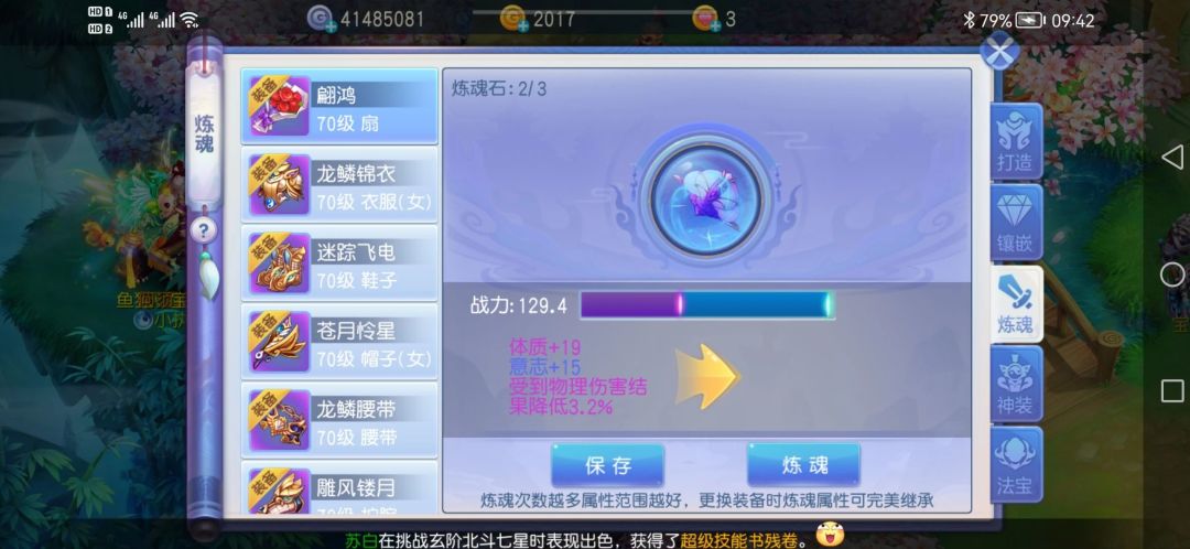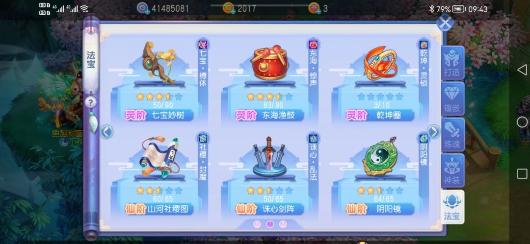 69级开启法宝系统,法宝分为凡阶、灵阶、仙阶和圣阶4种品阶。当法宝强化达到3、6、9级时将获得法宝技能强化,法宝等级上限10级(每半颗星为1级)。而且,所有法宝都要升,可适当优先提升本职业所需求属性对应的法宝。
