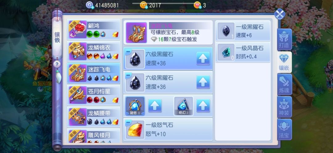 游戏中的宝石可以提升装备的属性,天启石可以获得套装属性,怒气石可以激发装备潜能。其中宝石共分9种:金刚石(物理攻击)、月光石(法术攻击)、紫玉髓(治疗)、翡翠石(封印)、红玛瑙(气血)、黑曜石(速度)、黄晶石(物理防御)、蓝晶石(法术防御)、风晶石(抗封)。