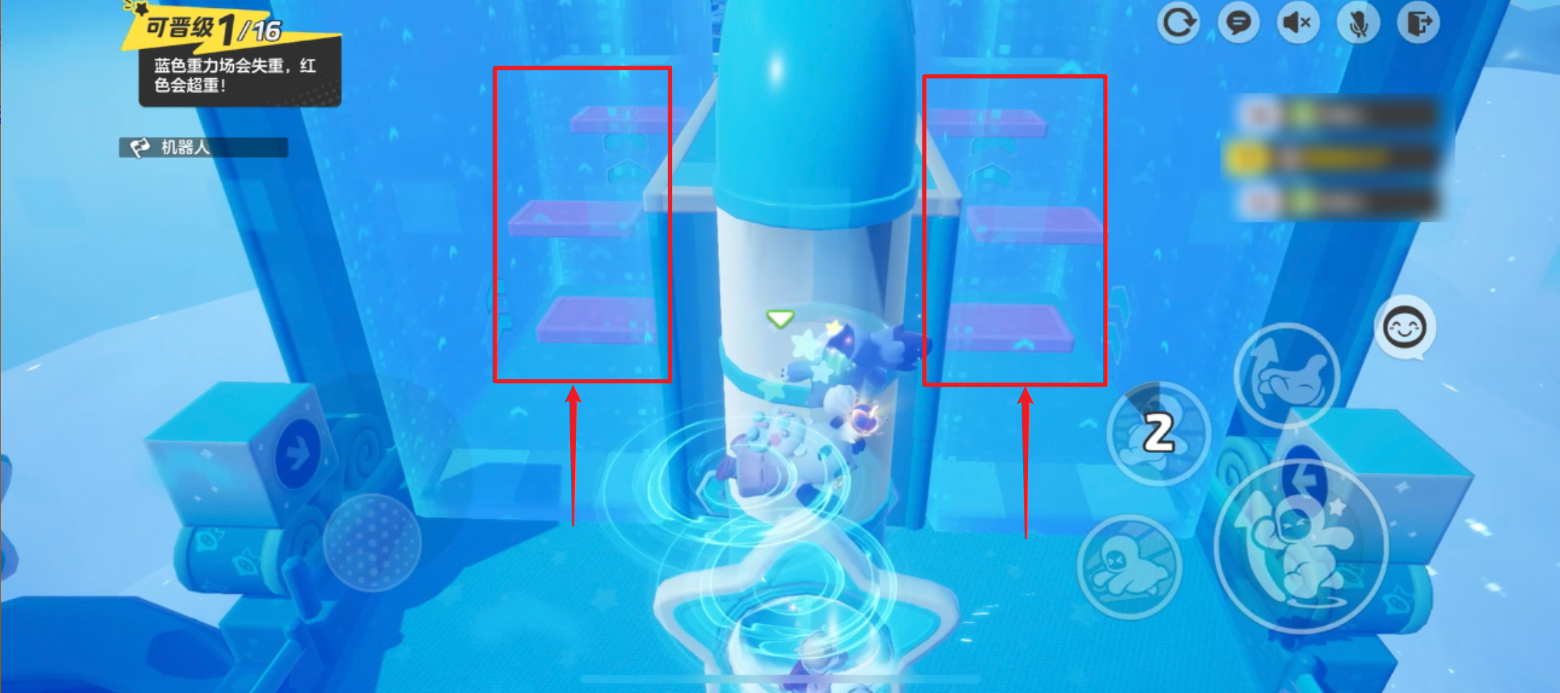 没有成功进入通风口的星宝也不用担心,可以从左右两侧的蓝色失重区通过,那里分布着三块红色平台供星宝借力跳跃,一样可以抵达终点喲!