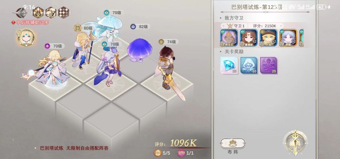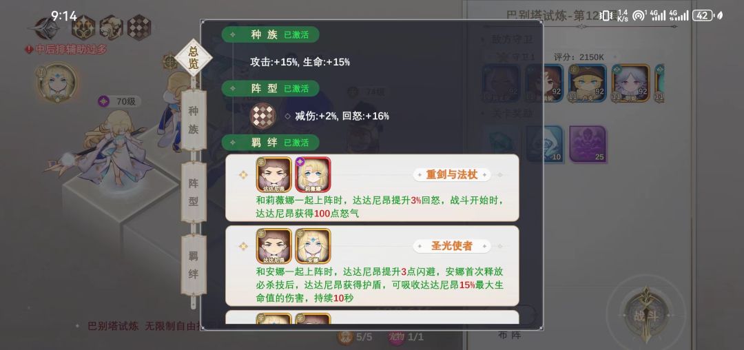 如上图用回怒16减防2的阵容,差不多是固定的位置,狐狸放缺口保护起来,后排3个看情况换位。10阶安娜基本可以上100层,13阶配好阵容能过120层虽然前期没狼人极限,但在中后期成型会慢慢赶上的,宠物后面菈菈星级高了可以替换狐狸。