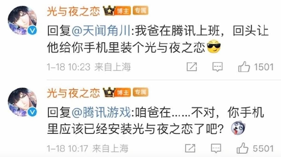 《光与夜之恋》也看上了这块的流量,挨个回复“我让我爹给你手机装光与夜之恋”。
