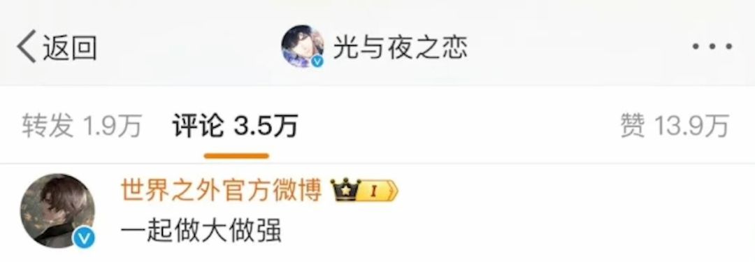 《世界之外》就跑到了《恋与深空》的微博下方蹭热度,还跑到了对家的《光与夜之恋》的评论区,留下了一句“一起做大做强”。