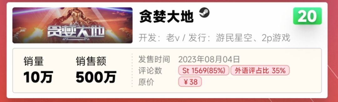 去年一度出圈的游戏,销售额基本在2000到3000 万。曾经被当成国产端游希望的《边境》只有1800万的销售额,销量25万。而且只要卖出10万份,销售额达到500万,就能挤进前20,看上去挺惨,实际上也是真的惨。