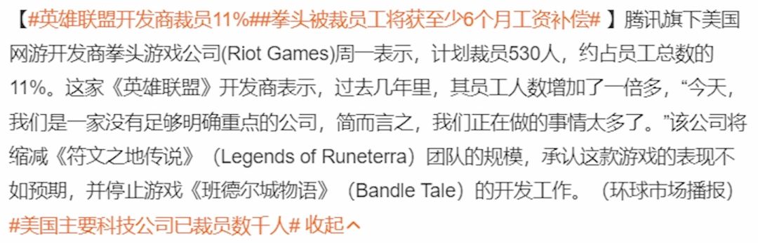 1月9日,Unity宣布将在3月底之前裁撤1800人。1月18日,谷歌在CEO备忘录里表示将会继续裁员。1月23日,拳头官方宣布将在全球范围内裁掉530个职位。