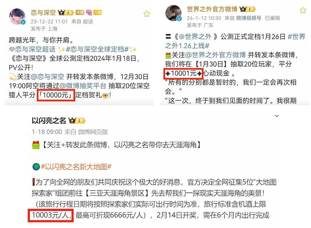 几家的抽奖金额也互相攀比,从《恋与深空》的10000,到《世界之外》的10001,再到《以闪亮之名》的10003,有的1块钱轻如鸿毛,有的1块钱重如泰山。
