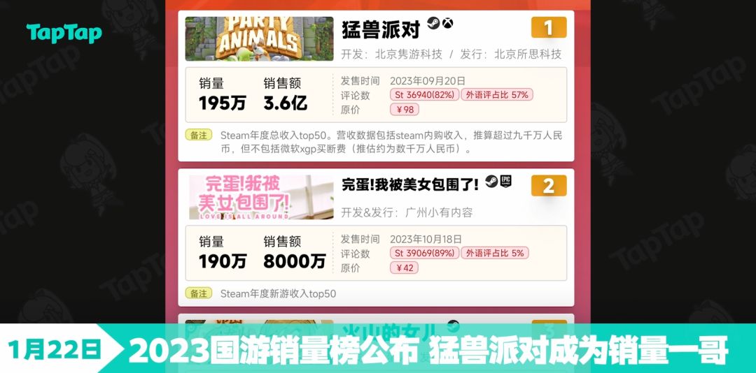 1月22日,2023国产游戏销量年榜正式公布,榜单突出一个一家吃肉,其他弟弟们抢汤。