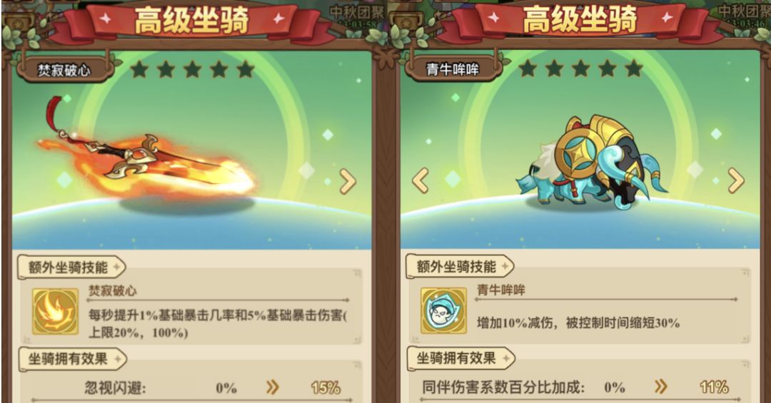 为了避免对手叠闪避躲避反击伤害,建议战士选择可以忽视闪避效果的高级坐骑焚寂破心。后期可以替换为增加10%减伤、减少被控时间的青牛哞哞。