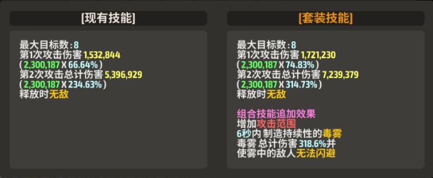 释放时获得无敌效果,组合技效果增加攻击范围,且6秒内制造持续性的毒雾,总计伤害318.6%并使雾中的敌人无法闪避。