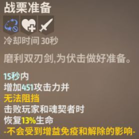 15秒内增加攻击力且无法阻挡,击败玩家和魂契者时恢复13%生命。