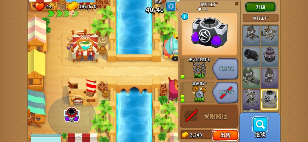 解法挺多,还是说个很无脑的过法吧,右边一个刺钉工厂破掉飞艇,卖掉工厂放左边挂机就行了,血很多,卖点也死不了。