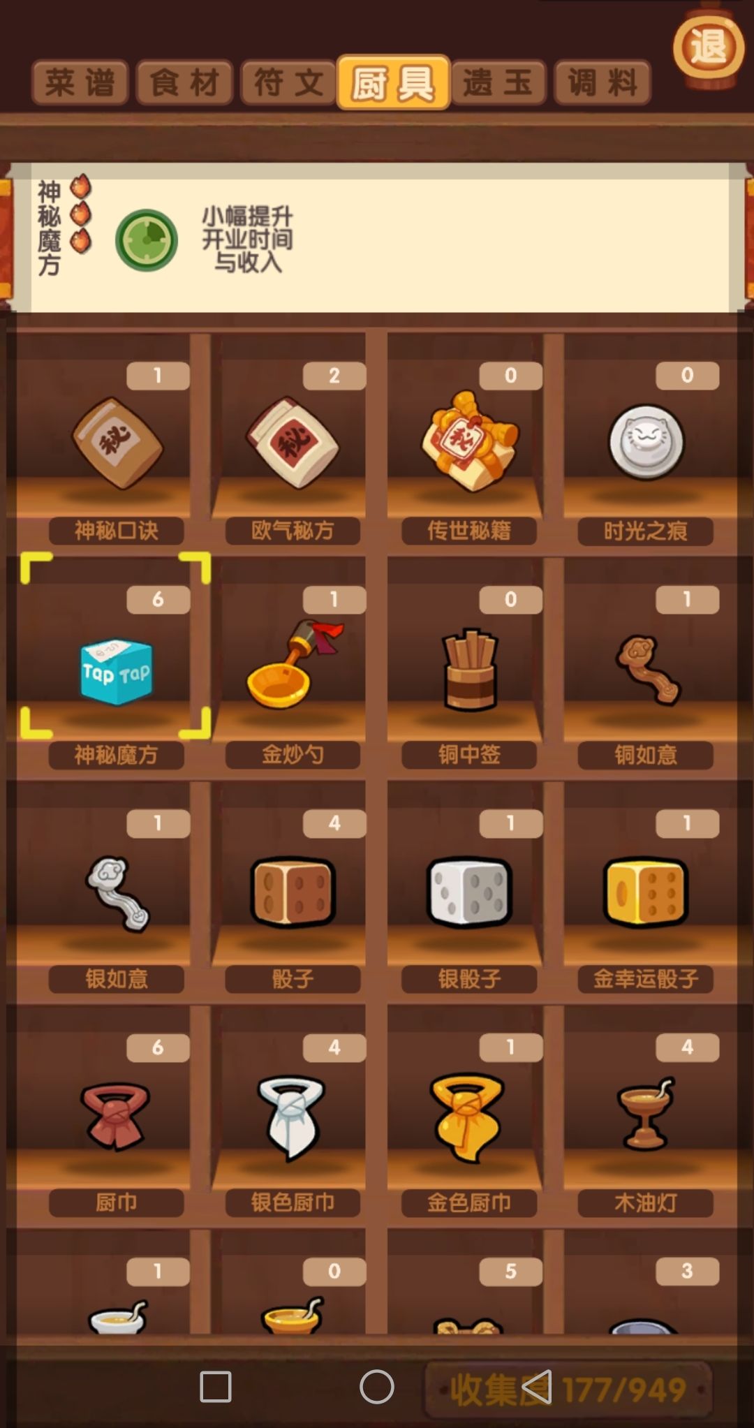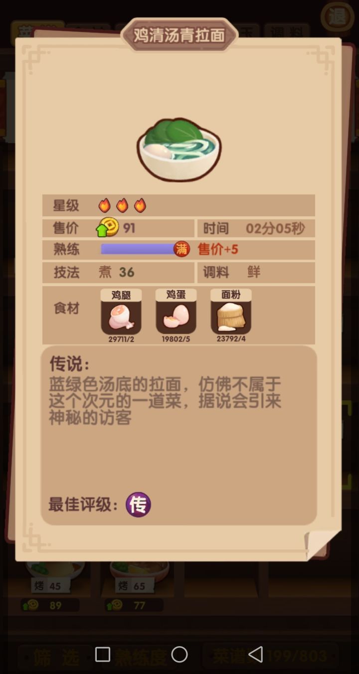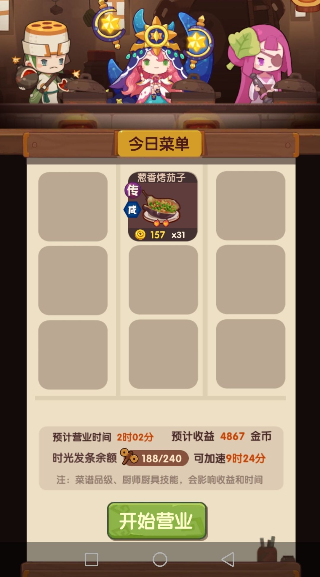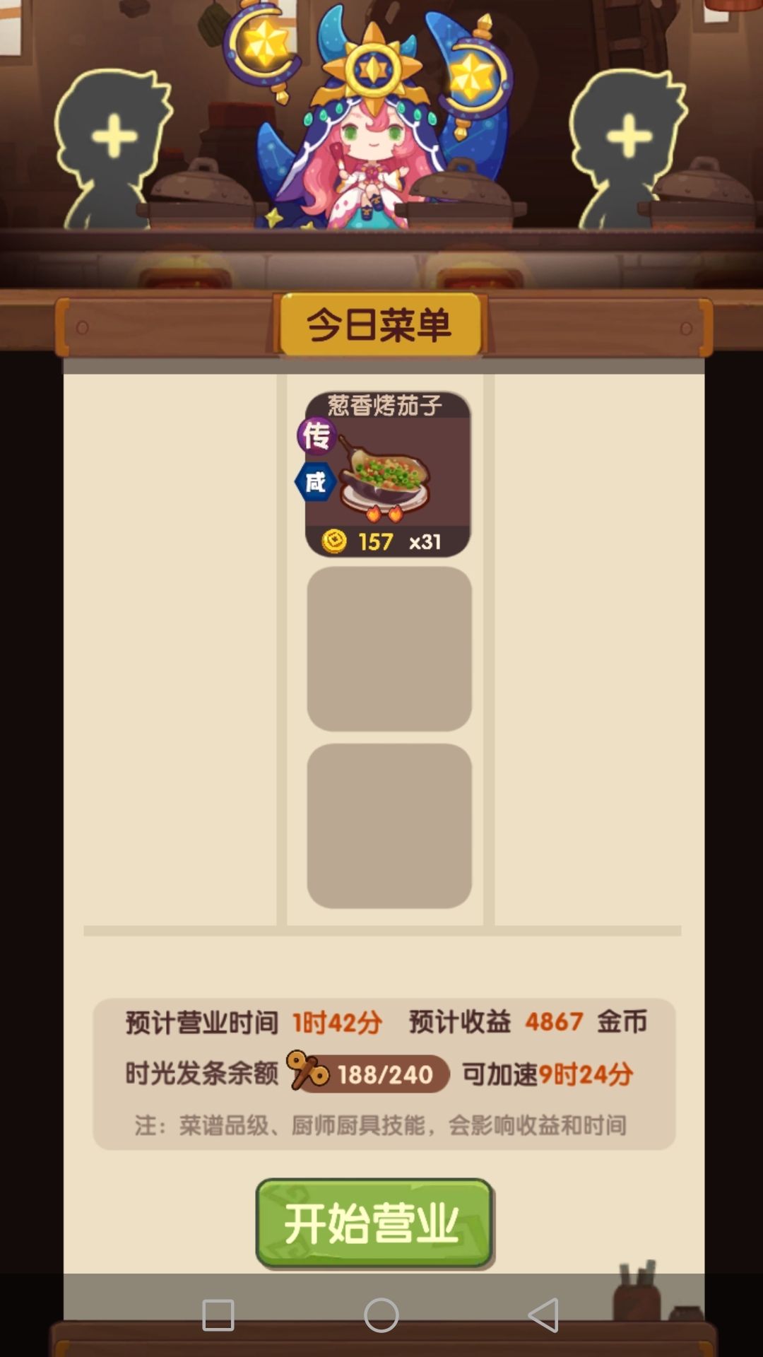 神秘魔方使用技巧:首先,青拉面首次神级会给一个。然后,用贵客队专精(可以用堂雪做到传)青拉面,完了之后大概有个2~4个魔方了。可以把其中2个给2个不用的厨子装上(比如雷椒和粉雪),然后专精菜的时候,上这2个厨子做啦啦队,第3个厨子负责把菜做到传。注意:增加10%金币这个效果只对自身有效,而增加10%开业时间则对全场都有效,并且不需要上菜也同样生效。图6、图7是示例,有无啦啦队的开业时间对比。