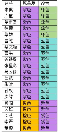 1. 部分名将品质颜色调整,属性、技能不变。