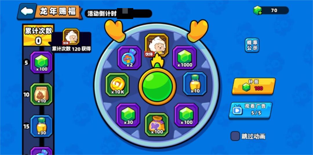 通过观看广告获取转盘机会,每天有五次机会,有概率获得传说伙伴【懒羊羊】等丰厚奖品,并且各位队长也不用担心,累次转盘次数同样可得传说伙伴【懒羊羊】PS:各位队长如果中途忘记了领取某天的奖励也不用慌,也可以花费100钻进行次数补签