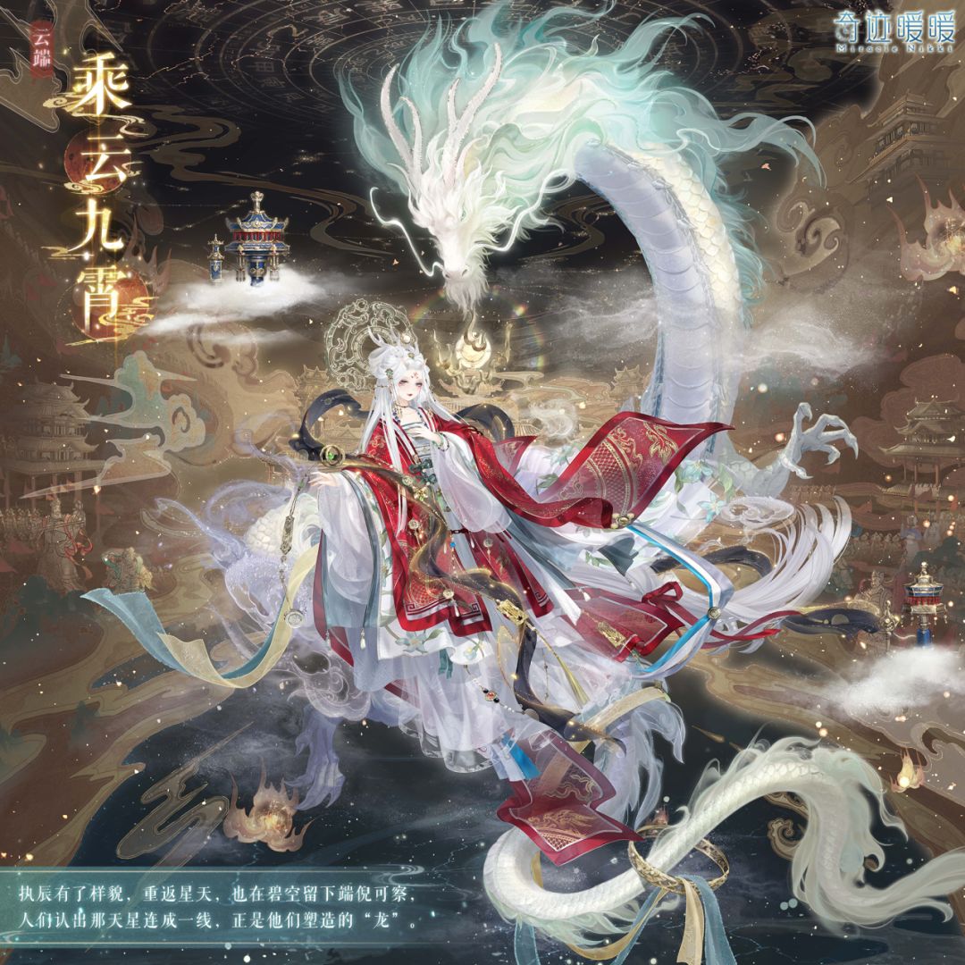 【乘云九霄】含正常姿势与特殊姿势,全新妆容“翩若惊鸿”,动态连衣裙“餐霞沐雨”,动态特姿发型“乘云归去”,动态飘带“御宇执辰”,龙角“麟角峥嵘”、“龙生九子”,精美面饰“彩云出岫”,动态摆件“驱雷掣电”、“拨云理雾”、“龙腾云野”。完成套装成就后可领取动态换装背景“蓬莱紫府”。