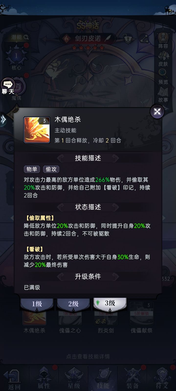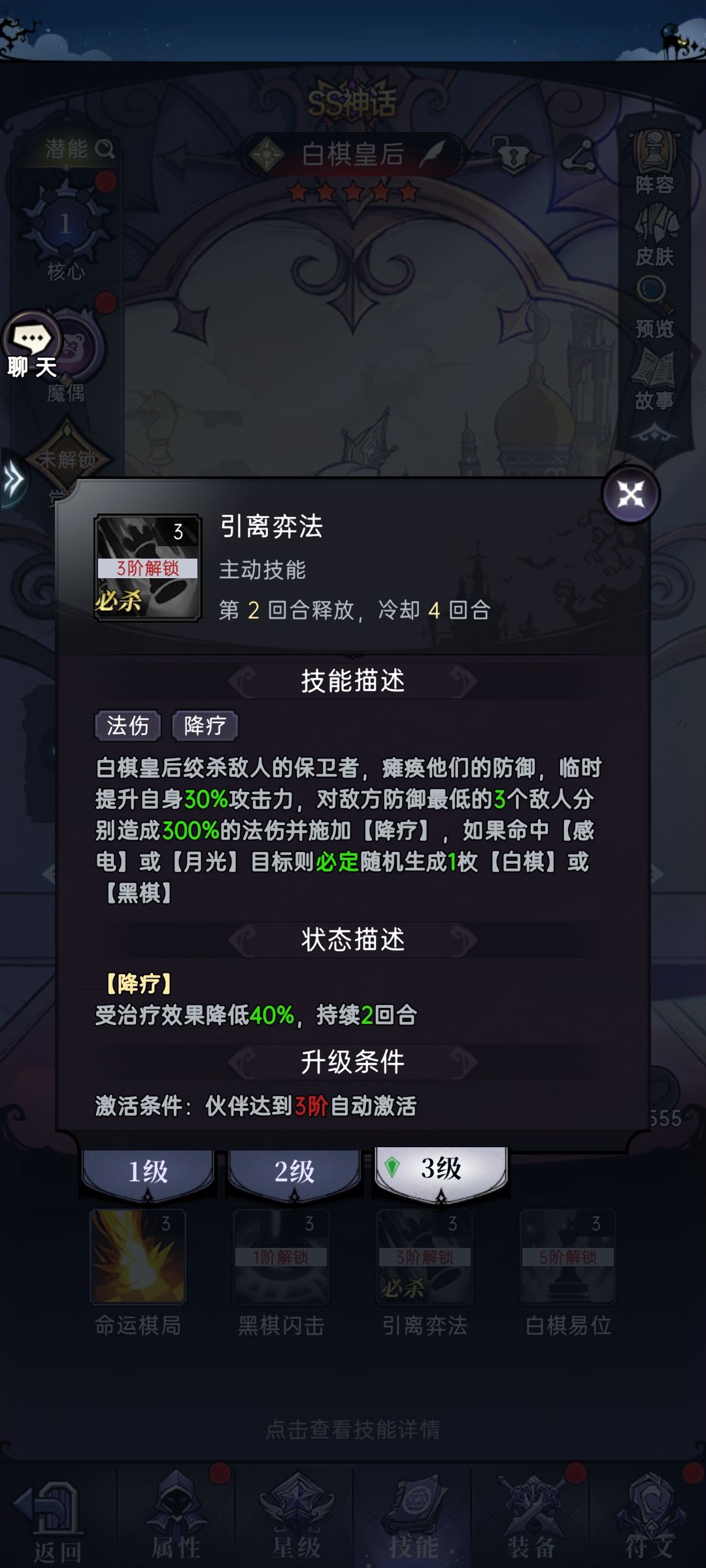 防御:如果将宠物防御调为最低,宠物最好是伙伴出手6次后召唤,基本就是第二回合开始时召唤,可以挡一段白棋的大招。怎么调成最低防御:2天赋当然不用升啦,对平民友好喔~别的资源也都随缘