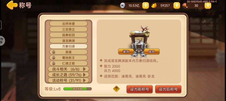 第六轮,从第三章开始打,询问意见-劝阻-王平,获得称号潜龙腾渊