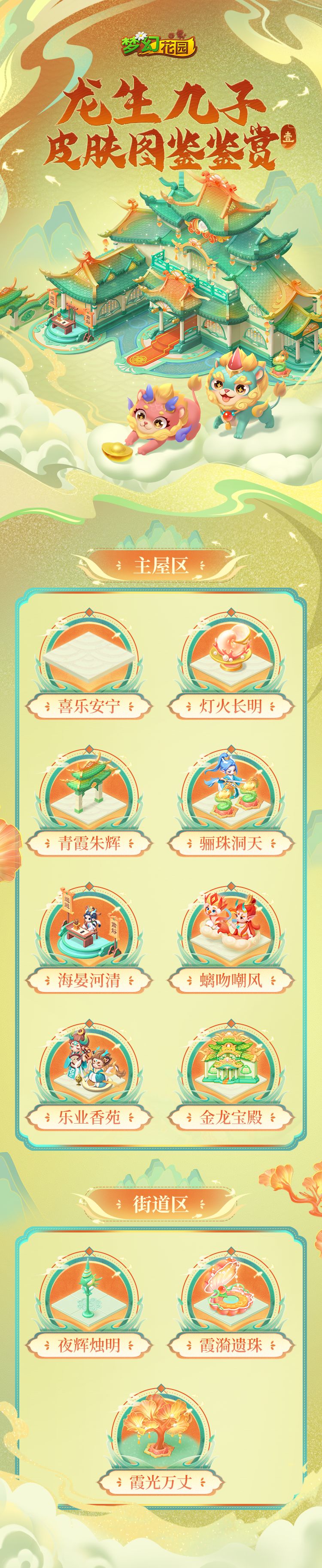 最详细皮肤图鉴来咯~本次新春限定皮肤“龙生九子”包含主屋区、街道区、喷泉区和树屋区,每一个区域都有自己的特色,快来一起看看吧~