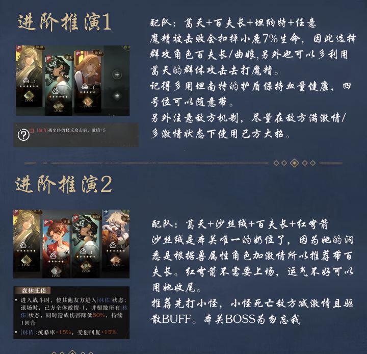 沙丝绒是本关唯一的奶位了,因为她的洞悉是根据兽属性角色加激情所以推荐带百夫长。红弩箭不需要上场,运气不好可以用她收尾。
