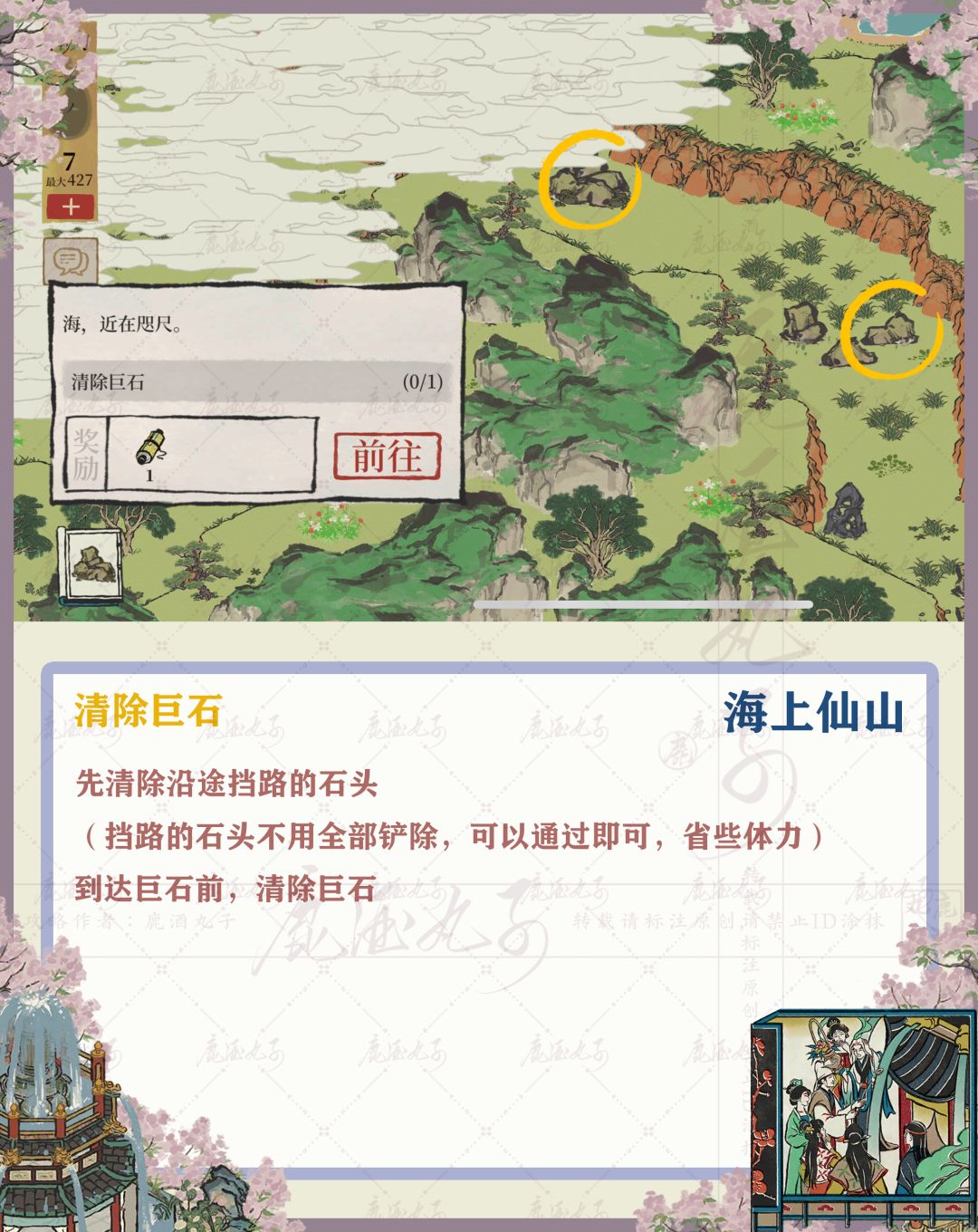 🌸先清除沿途挡路的石头(挡路的石头不用全部铲除,可以通过即可,省些体力)