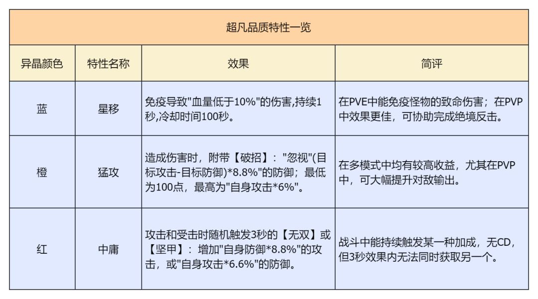 3、每种颜色的『超凡品质特性』均为唯一被动,不可叠加。