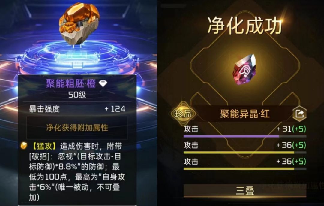 (普通异晶+1净化值,稀有异晶+4净化值;分解时有概率获得对应颜色的原石)