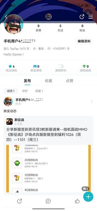 把资讯转发动态后TapTap个人主页如图显示